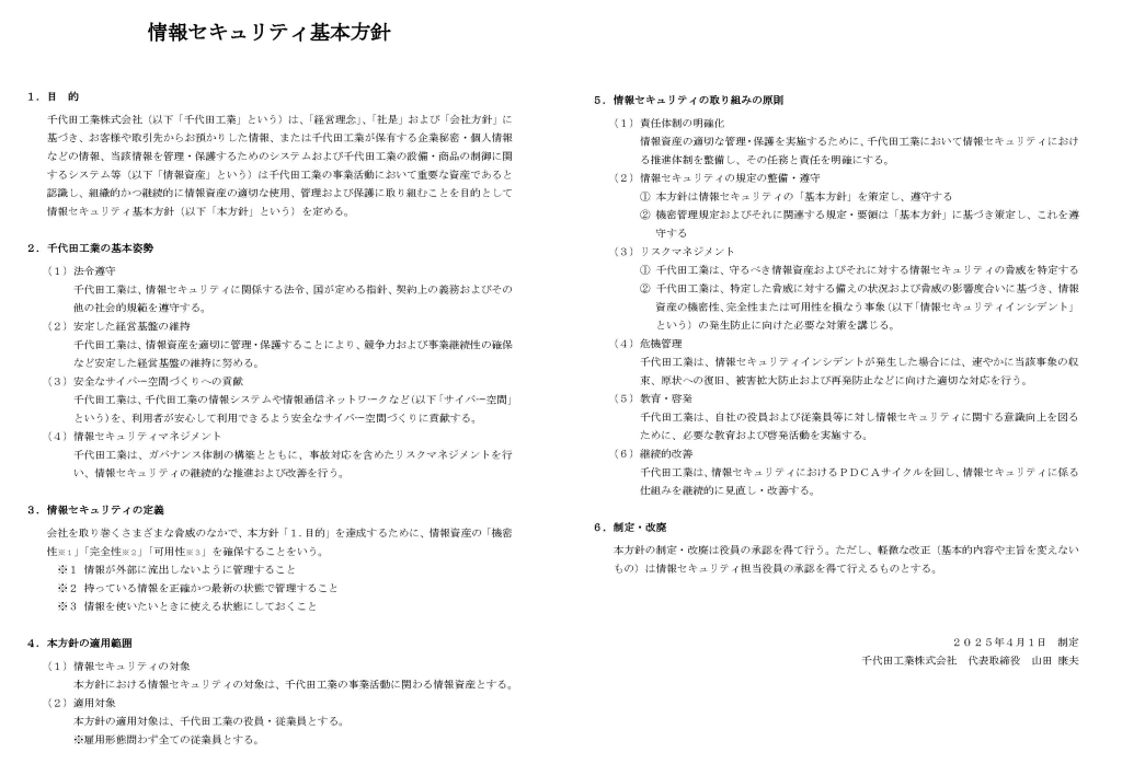 当社は、事業活動を正常かつ円滑に行う上で、情報セキュリティの確保が重要課題のひとつであると考え、顧客の秘密情報や個人情報および当社の情報資産を保護する指針として、情報セキュリティ基本方針を策定し、以下の通り実施し推進します。